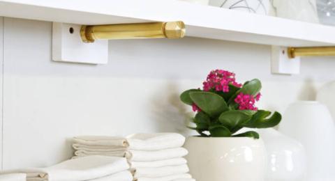 Don’t hide away. Try adding some open shelving in an unused spot, such as above the sink or window, or next to the cabinets. Display your most beautiful dishes and add some decorative pieces to give the space a modern, airy feel.